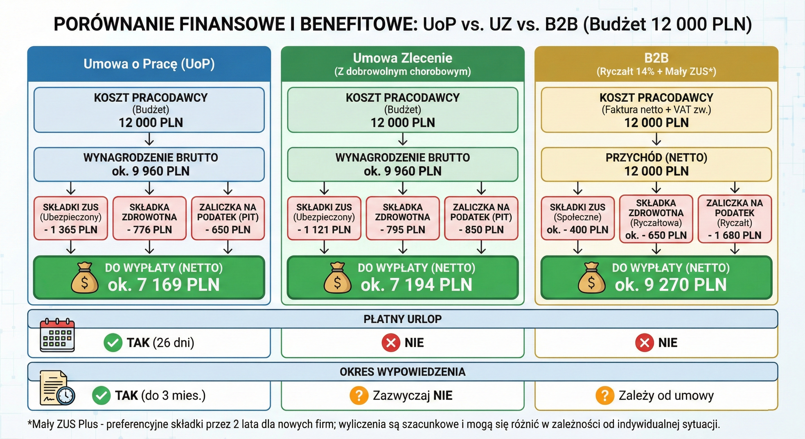 - Brak przywilejów pracowniczych: Brak płatnego urlopu i ochrony przed zwolnieniem (wszystko zależy od ustaleń w kontrakcie).